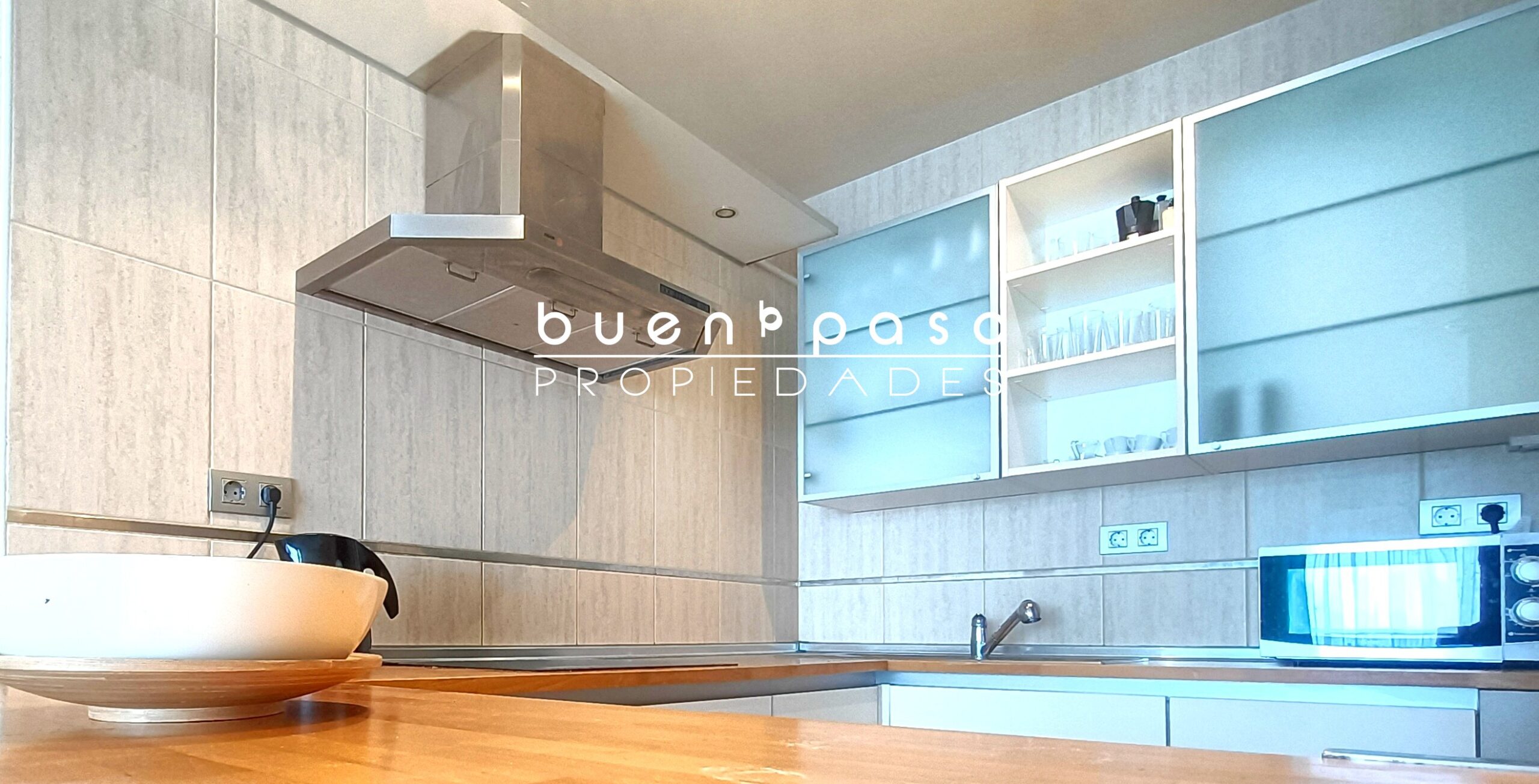 La cocina abierta al salón crea un ambiente funcional y elegante, ideal para compartir con amigos o disfrutar de una tranquila cena.